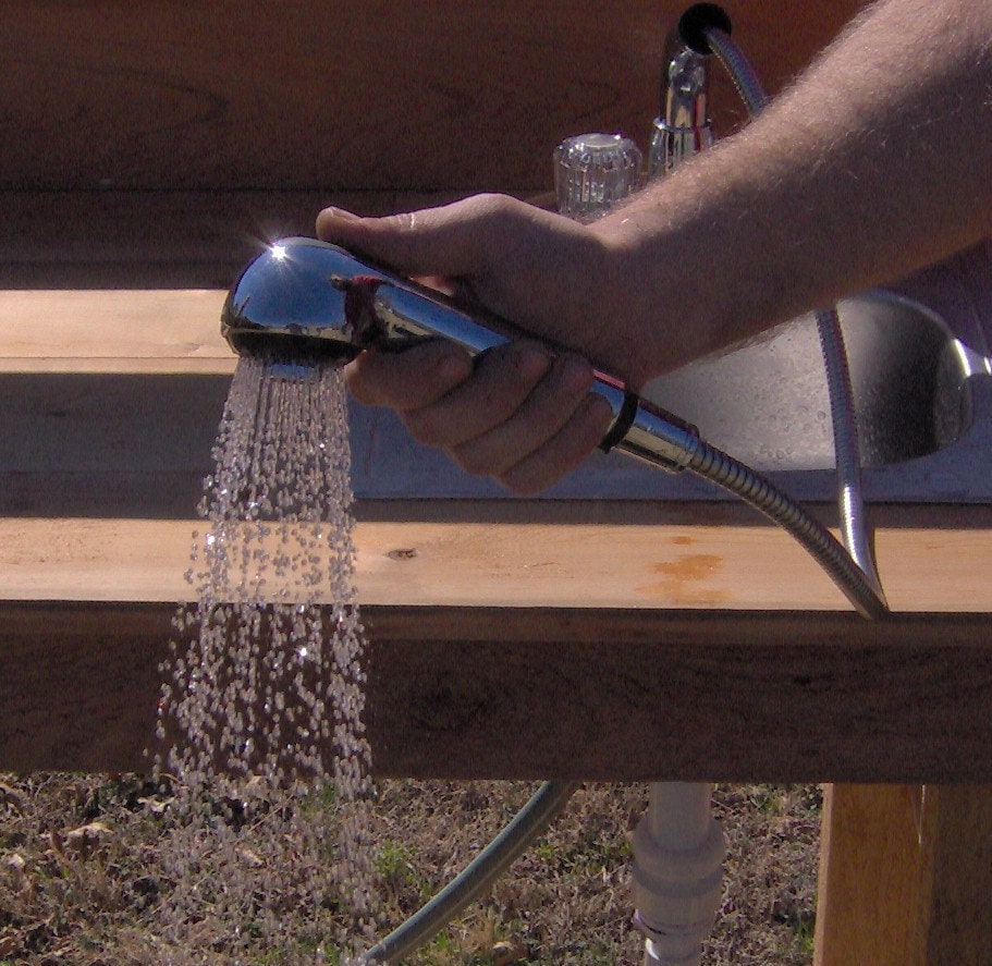 The bench features a spacious working area and a stainless steel sink with faucet that hooks up to a garden hose. The faucet can be switched from a stream to a spray and has a pullout sprayer that reaches the whole bench surface. The drain on the sink is also set up so that a garden hose can hook to it and you can have the water drain through the garden hose to anywhere that you want it to drain.